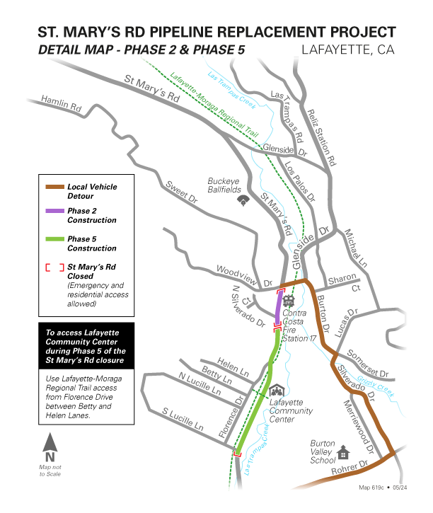 Starting on June 3, 2024, EBMUD crews will begin installing a new water pipeline to enhance water service in your Lafayette neighborhood. Please refer to the detour map below to see how St Marys Road will be affected. Side streets intersecting with St Marys Road will also experience temporary impacts as work progresses. The project is expected to continue until October 2024, and the duration of construction on each street may vary. Final paving will follow the completion of construction. For details on the affected work area, please review the accompanying detour map.