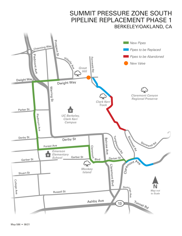 An East Bay Municipal Utility District (EBMUD) contractor will replace aging pipelines that move water within the Summit Pressure Zone – one of the many topographic sections of our service area separated by elevation from the flats to the hills.